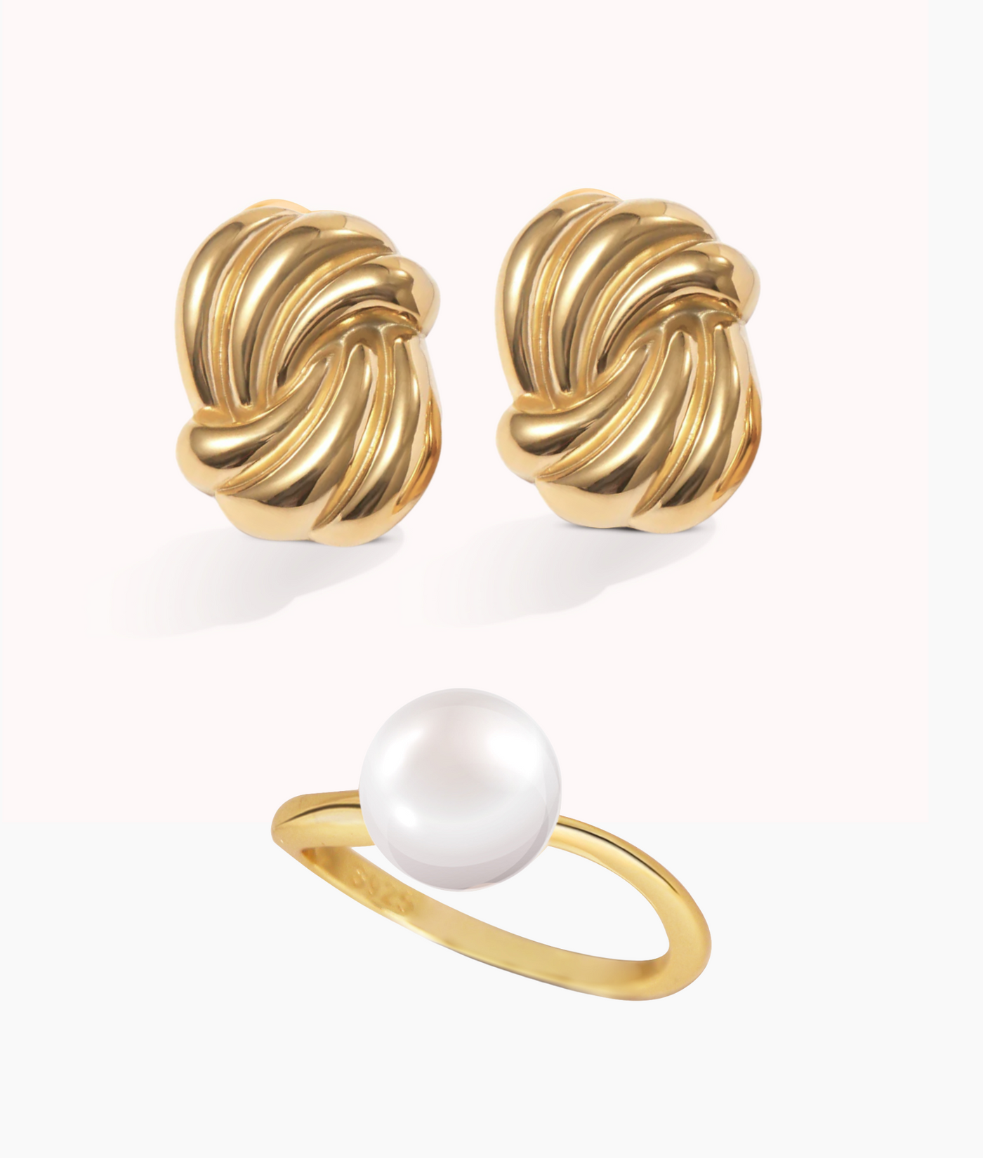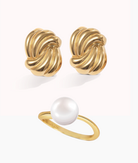 Pearl Ring & Wave Earring Set - Gold - Extra Small: UK J1/2