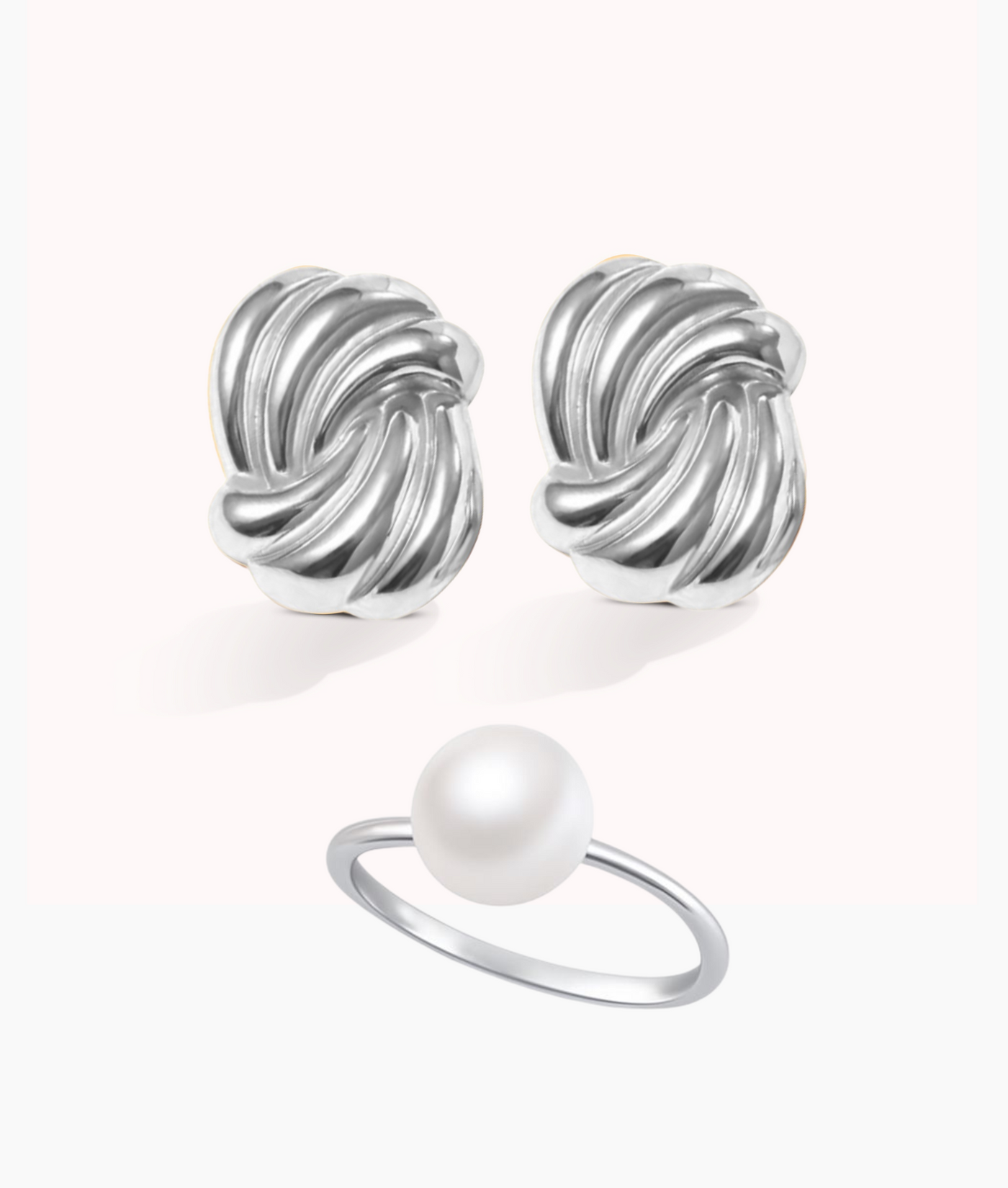 Pearl Ring & Wave Earring Set - Silver - Extra Small: UK J1/2